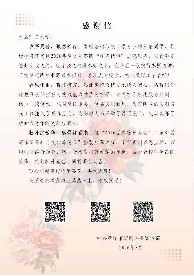 近日,青岛理工大学基础教学部收到一封来自中共菏泽市定陶区委宣传部的感谢信。信中表扬该校统计学专业学生王晴,在当地“暖冬伙伴”志愿服务中扎根基层、倾情奉献。这不仅是对一名青年学子的肯定,更是高校实践育人成果的生动见证。